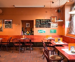 Innen mit absinthgrünen Resopaltischplatten, Gussterrazzo-Boden und der klassischen Schank , außen lauschige L ...